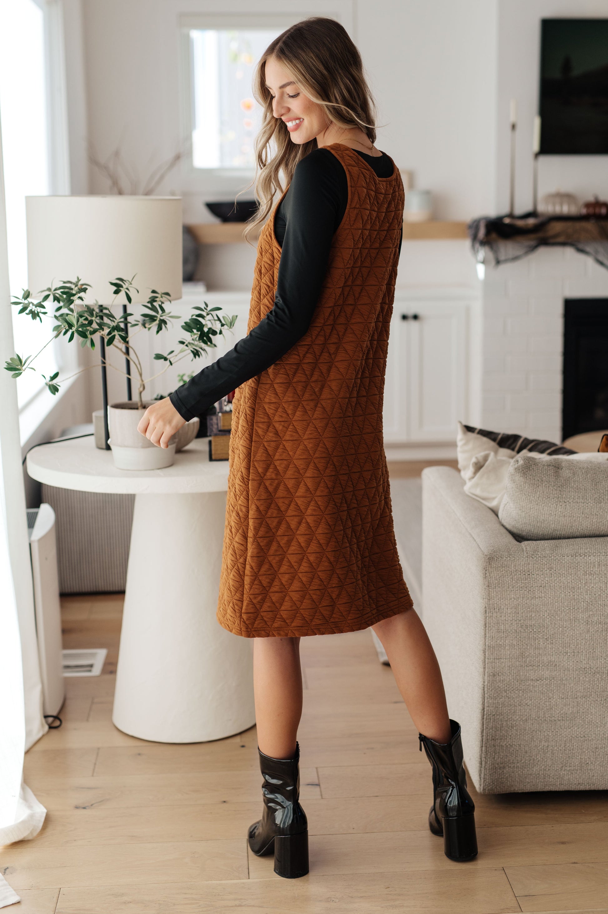This Free Falling Quilted Midi Dress is made with a cozy quilted fabric, scoop neckline, and front pockets for added style. It's a jumper style midi dress that's perfect for layering over your favorite top or tights. Get ready to feel fashionable all season long!