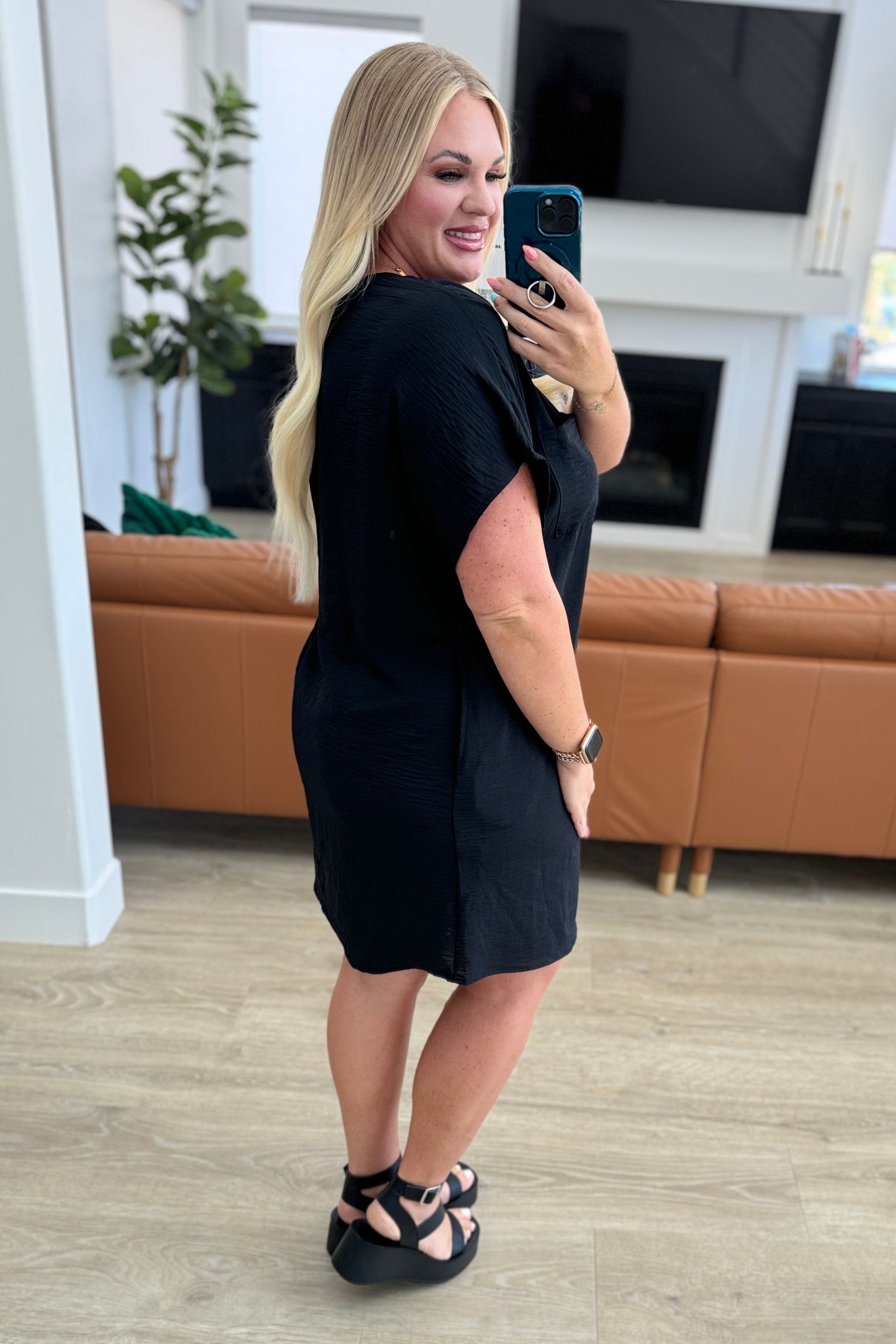 Score your next go-to outfit with the Go-Go Girl T-Shirt Dress. The crinkle woven fabric adds texture while the banded V-neckline and dolman sleeves offer a chic silhouette. Don't forget about the added convenience of a front patch pocket. Perfect for any occasion, this dress will have you looking and feeling confident.
