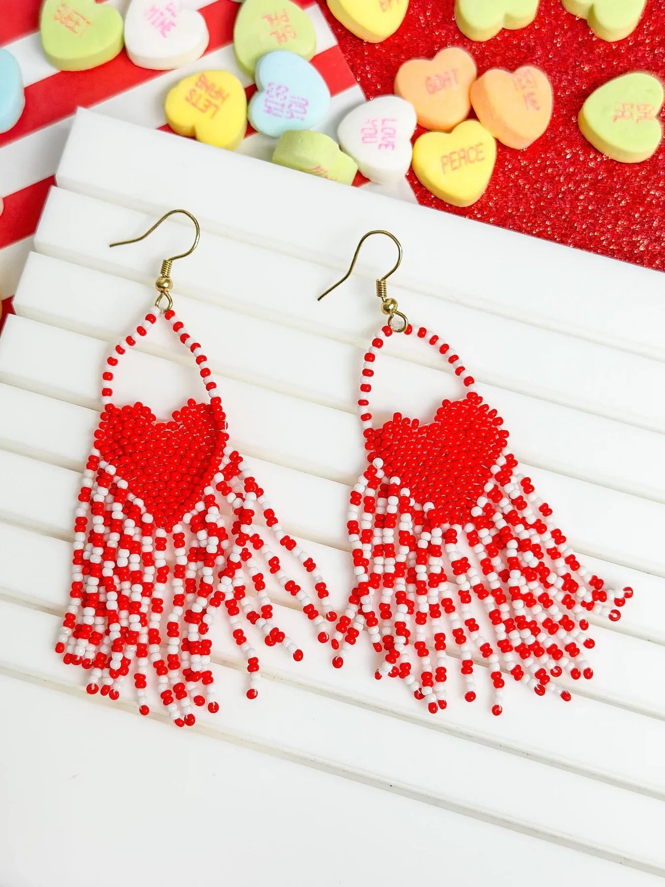 These Heart Beaded Tassel Earrings combine fun and fashion with love hearts and fringe beading.