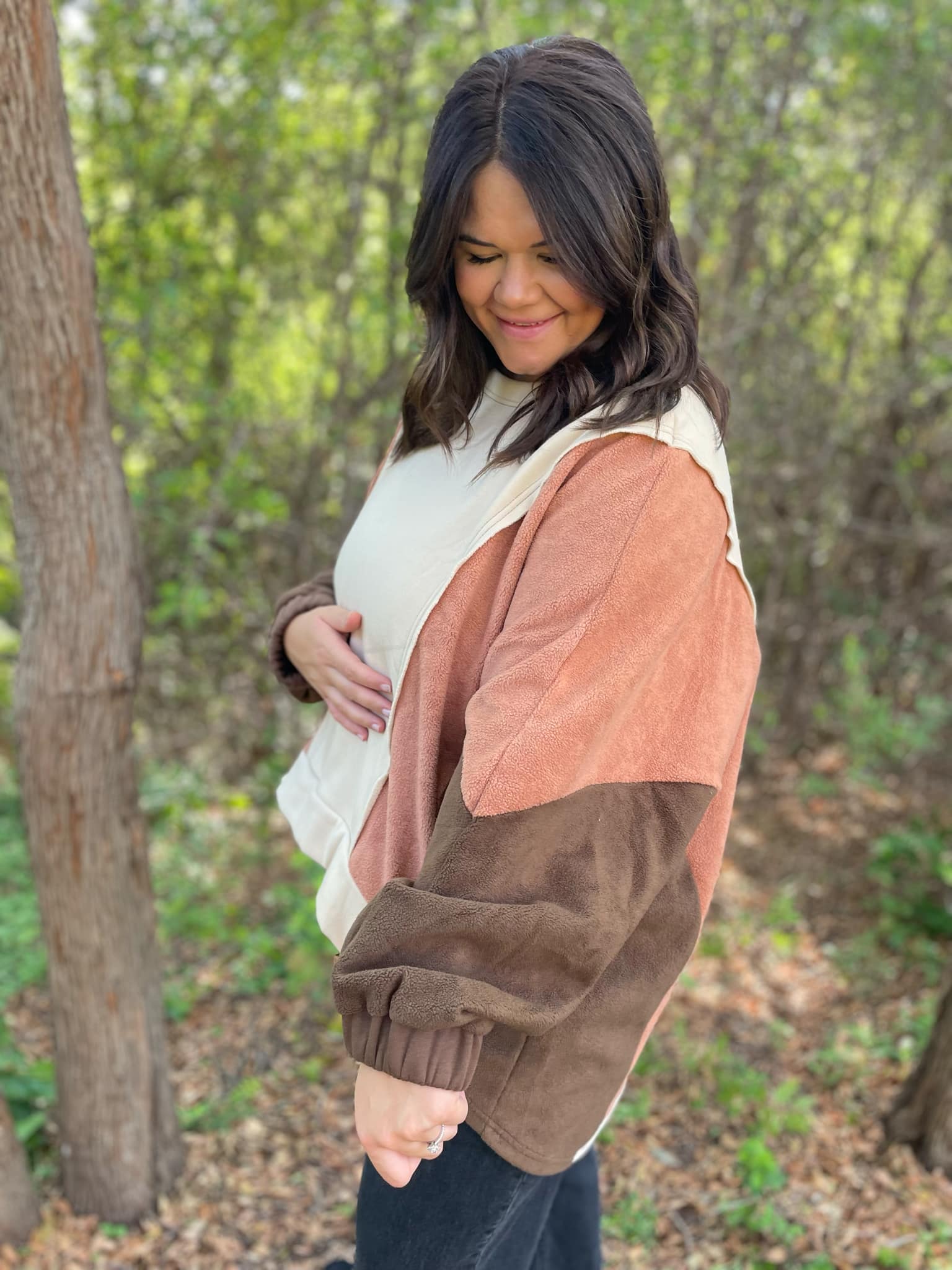 The oversized hooded pullover has such an eye-catching combination of fabrics and colors! With exposed seams, soft sherpa details and a flattering color block design - you will want to live in this all winter long!
