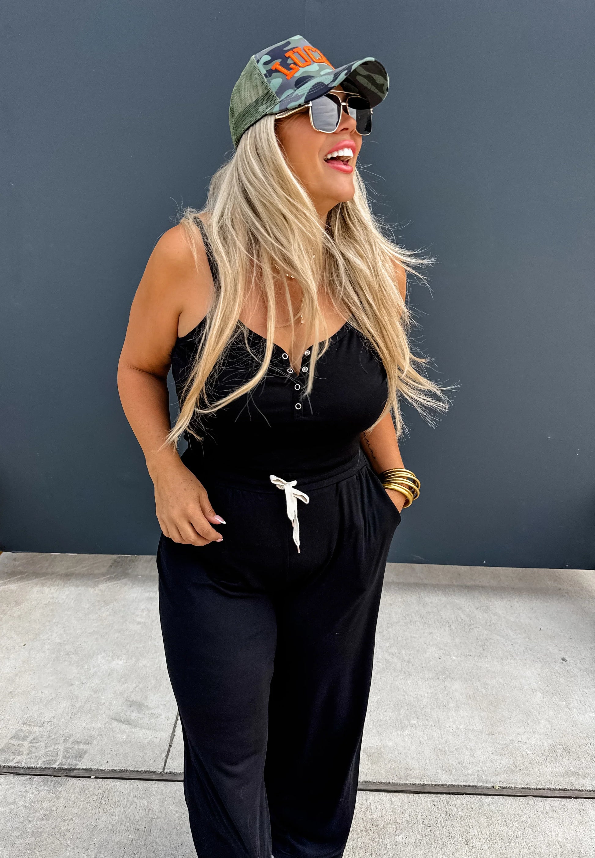 Romper: Features an elastic banded waist with working drawstring, adjustable shoulder straps, snap button neckline and side pockets.