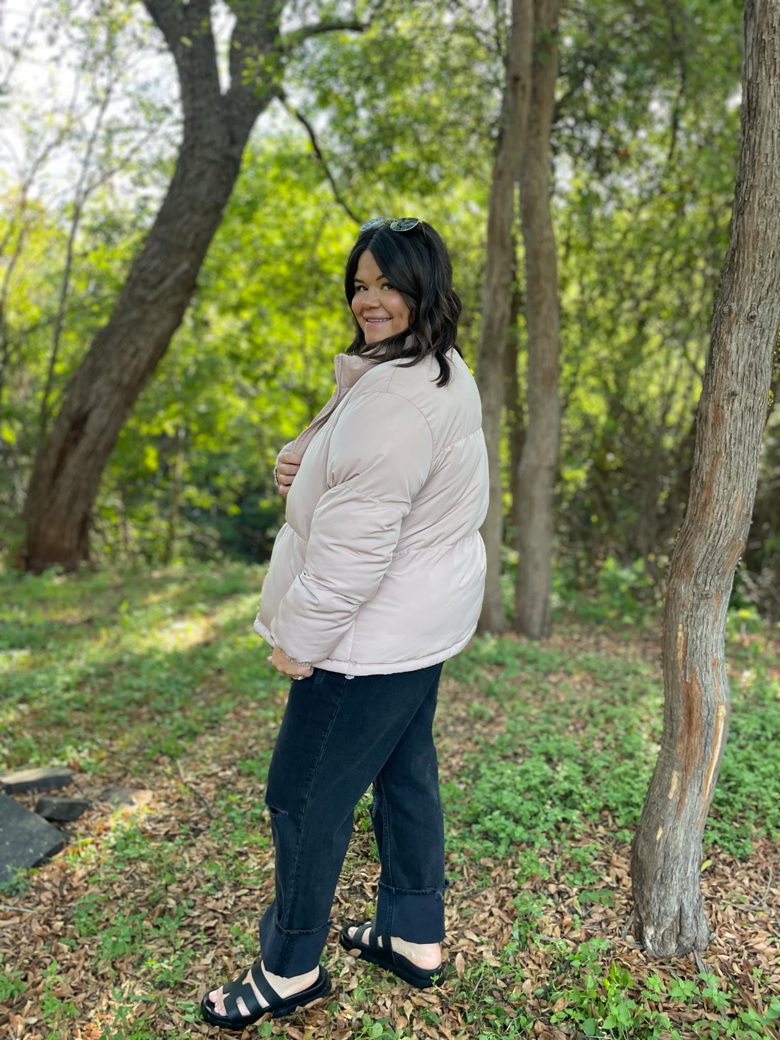 The COLOR of this puffer jacket! It has just a touch of a pinky-blush hue but still has a very neutral and versatile feel. It has a full zipper closure with a high neck and pockets to keep you cozy warm on the chilliest days.