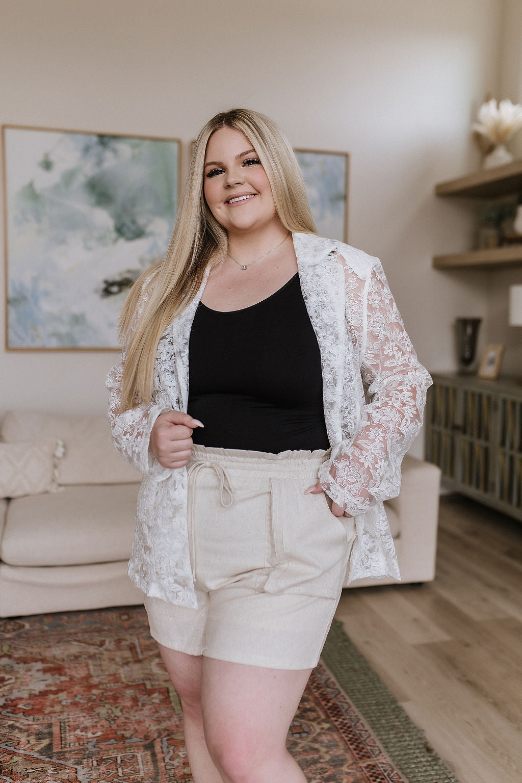 Look and feel your best all summer in these Sitting, Waiting, Wishing Linen Blend Shorts. Woven with a linen blend, they feature gusset front pockets, an elastic waistband, and a high-waisted cut for a flattering fit. You'll be wishing for endless summer days in their timeless style.